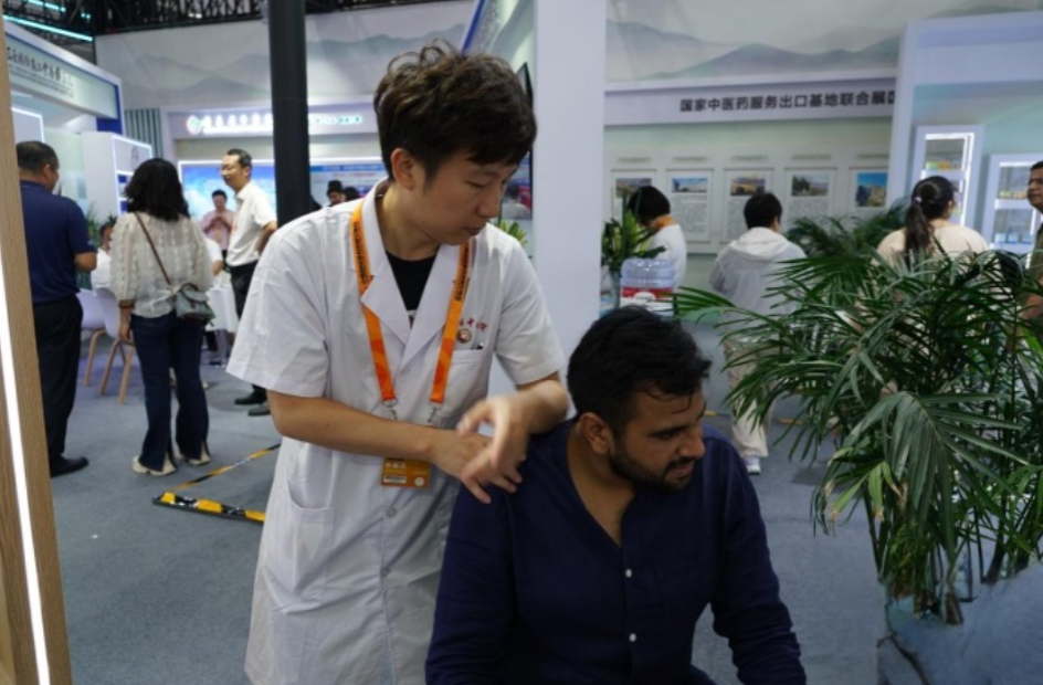 国际友人在厦门市中医院展区体验推拿手法