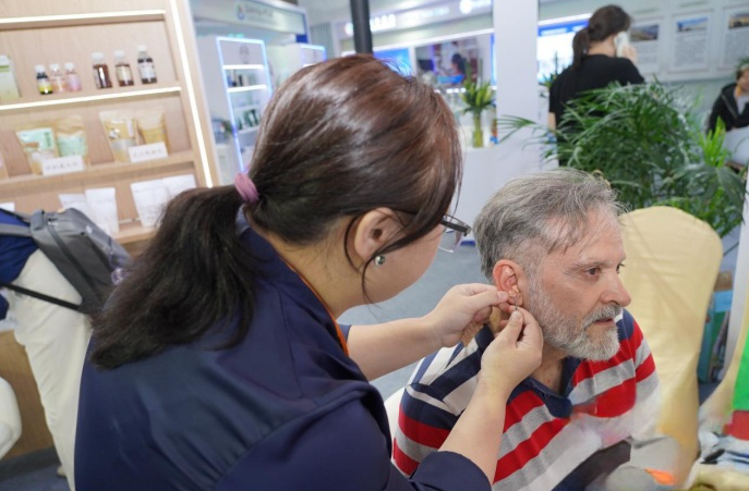 外国友人在厦门市中医院展区体验耳穴埋豆