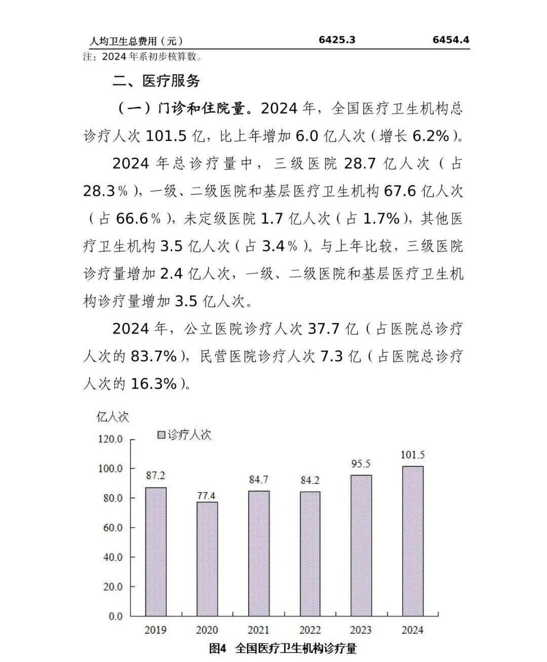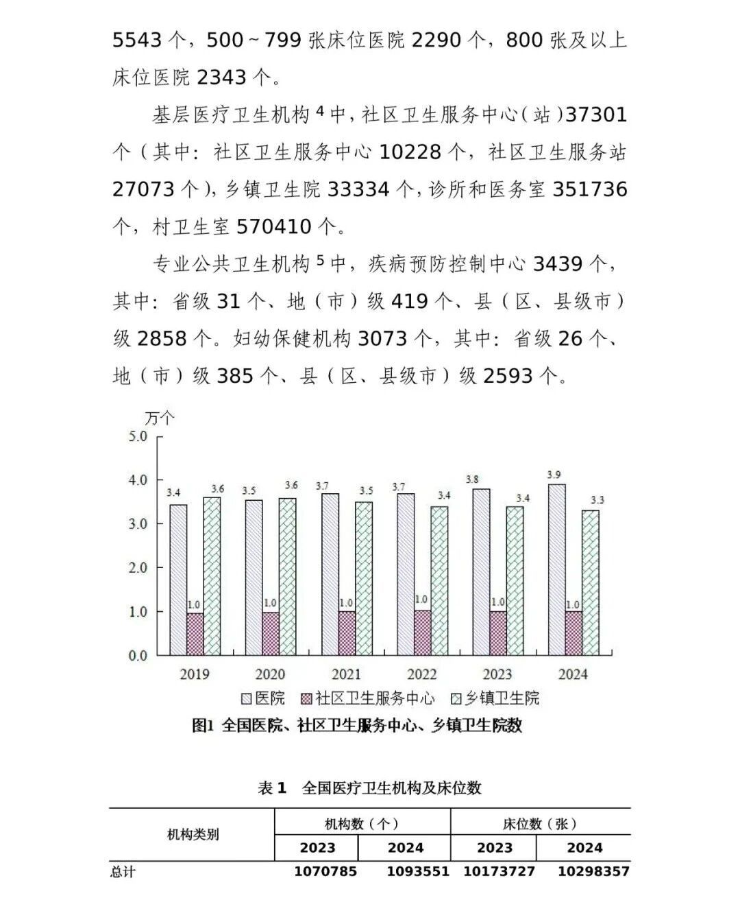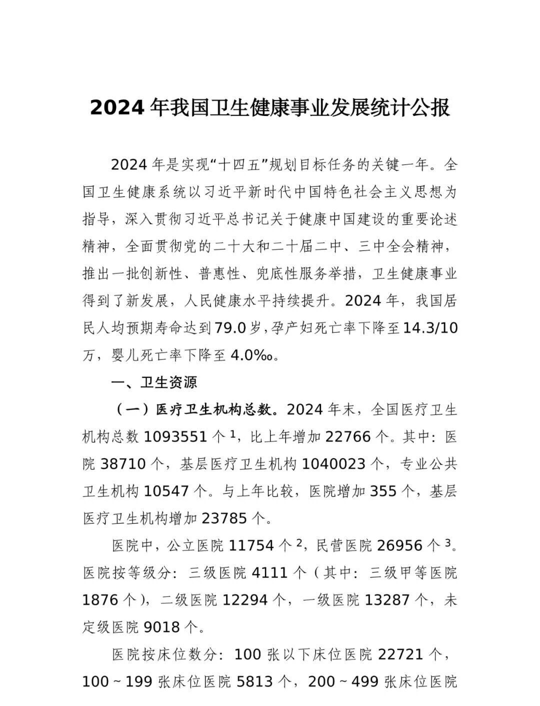 近日,国家卫生健康委发布《2024年我国卫生健康事业发展统计公报》。根据《公报》,我国人均预期寿命达到79岁,孕产妇死亡率下降到14.3/10万,婴儿死亡率下降至4.0‰。统计数据表明,全国卫生健康系统以习近平新时代中国特色社会主义思想为指导,深入贯彻习近平总书记关于健康中国建设的重要论述精神,全面贯彻党的二十大和二十届二中、三中全会精神,推出一批创新性、普惠性、兜底性服务举措,卫生健康事业得到了新发展,人民健康水平持续提升。《公报》显示,卫生资源总量持续稳步增长。2024年末,全国医疗卫生机构总数1093551个,比上年增加22766个,其中医院38710个,比上年增加355个。2024年末,卫生技术人员1302.0万人,比上年增加53.1万人(增长4.3%),其中医院卫生技术人员937.4万人。2024年,每千人口执业(助理)医师3.61人,每千人口注册护士4.16人,每万人口全科医生4.54人。2024年末,全国共有乡镇卫生院33334个,床位150.1万张,168.2万人(其中卫生技术人员141.2万人)。与上年比较,乡镇卫生院减少419个,床位减少0.3万张,人员增加7.7万人。乡镇卫生院减少的主要原因是行政区划调整,部分乡镇卫生院合并,全国共有社区卫生服务中心(站)37301个,卫生人员82.8万人,卫生人员数比上年增加5.0万人。全国共有村卫生室57.0万个,在村卫生室工作的人员124.2万,其中执业(助理)医师和持乡村医生证的人员102.6万人,与上年比较,村卫生室数减少1.2万个。村卫生室减少的主要原因是行政区划调整,部分村卫生室合并。《公报》指出,医疗服务提供量和效率同步提升。2024年,全国医疗卫生机构总诊疗人次101.5亿,比上年增加6.0亿人次;入院人次31192.0万,比上年增加1004.7万人次。全国医院病床使用率78.8%,其中,公立医院84.8%。医院出院患者平均住院日为8.6日,其中公立医院为8.0日。2024年,一、二级医院和基层医疗卫生机构诊疗人次为67.6亿人次,占总诊疗人次的66.6%。其中,乡镇卫生院、社区卫生服务中心(站)、村卫生室诊疗人次39.8亿,比上年增加2.3亿人次。《公报》表明,次均医疗费用控制有成效。2024年,医院次均住院费用9870.0元,按当年价格比上年下降4.3%,按可比价格下降4.5%;次均门诊费用361.0元,按当年价格比上年下降0.2%,按可比价格下降0.4%。2024年全国卫生总费用初步核算为90895.5亿元,其中:政府卫生支出22608亿元,占24.9%;社会卫生支出43280亿元,占47.6%;个人卫生支出25007.5亿元,占27.5%。人均卫生总费用6454.4元,卫生总费用占GDP的比重为6.7%。在中医药服务、疾病预防控制和公共卫生工作等方面,根据《公报》,2024年,全国中医类医疗卫生机构总数103704个,比上年增加11173个;中医药卫生人员总数115.9万人,比上年增加11.4万人;总诊疗人次16.8亿,比上年增加1.5亿人次;出院人次5271.0万,比上年增加290.0万人次。专业公共卫生机构卫生技术人员80.7万人,比上年减少0.1万人。加强重大疾病与健康危害因素控制,血吸虫病、地方病、慢性病、职业病防治工作等取得积极进展。2024年,在基层医疗卫生机构接受健康管理的65岁及以上老年人数14136.0万。