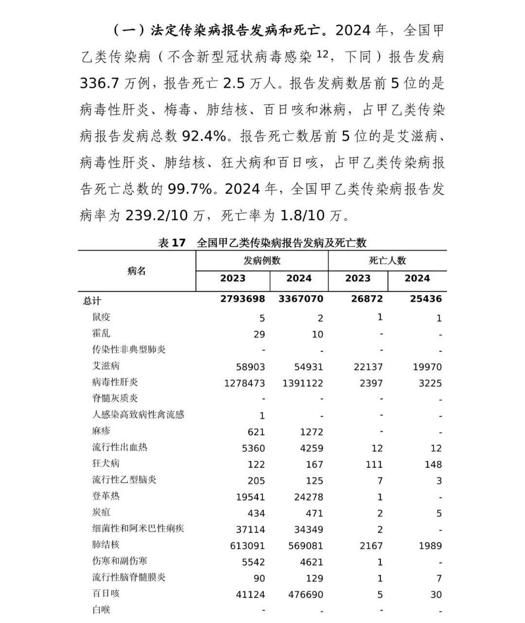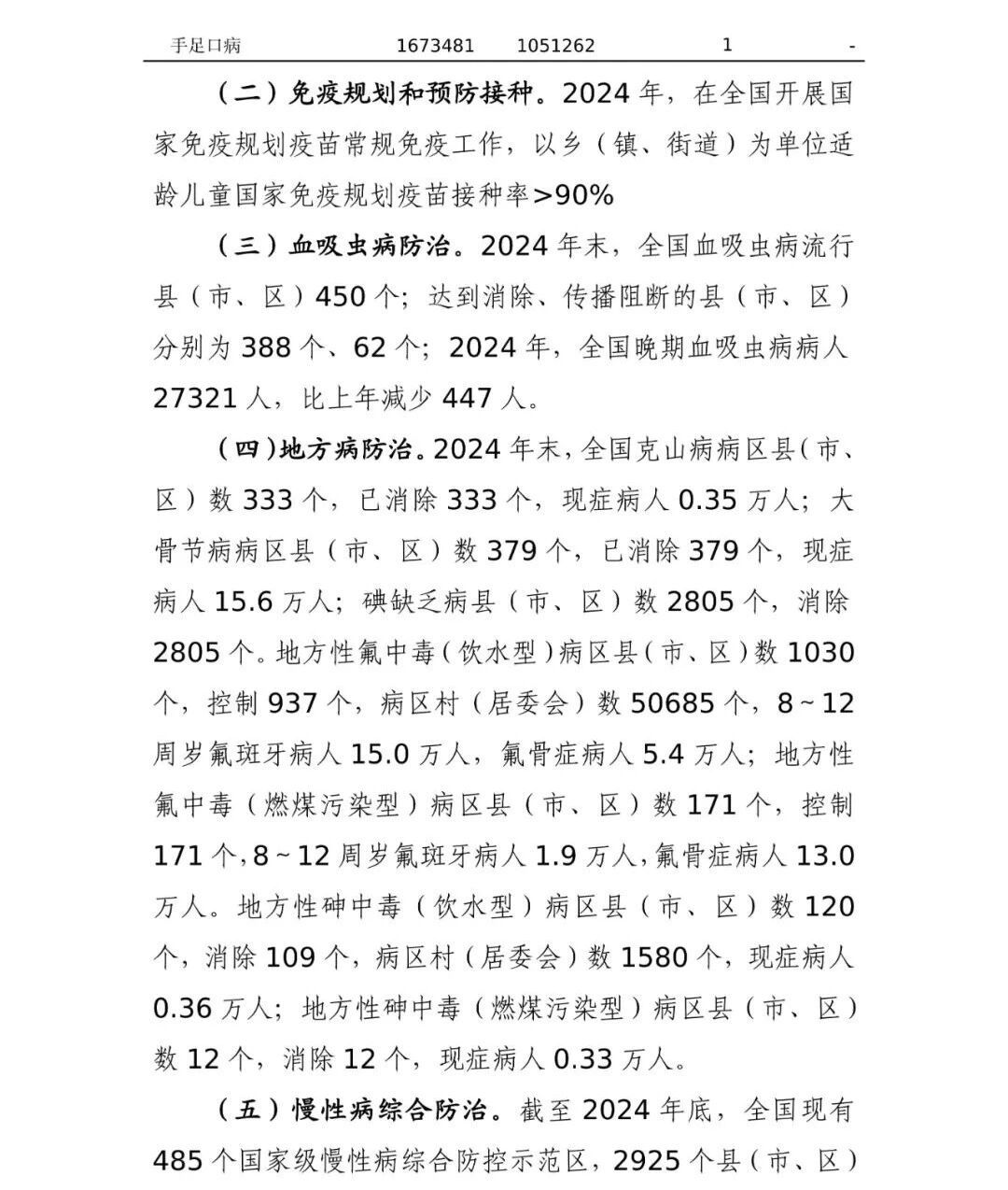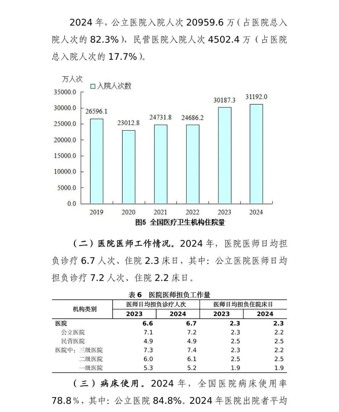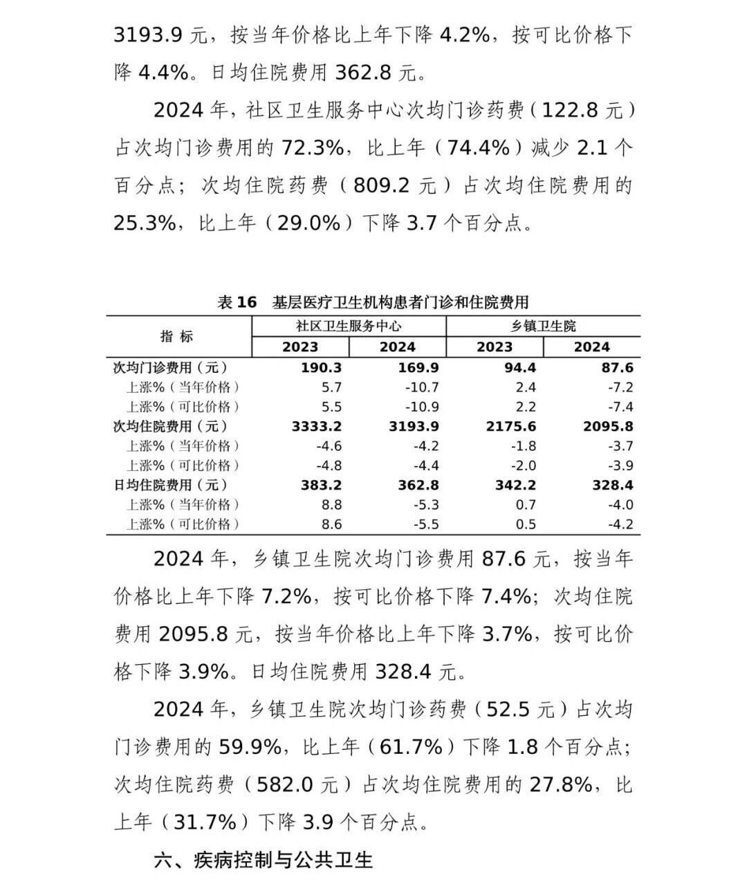 近日,国家卫生健康委发布《2024年我国卫生健康事业发展统计公报》。根据《公报》,我国人均预期寿命达到79岁,孕产妇死亡率下降到14.3/10万,婴儿死亡率下降至4.0‰。统计数据表明,全国卫生健康系统以习近平新时代中国特色社会主义思想为指导,深入贯彻习近平总书记关于健康中国建设的重要论述精神,全面贯彻党的二十大和二十届二中、三中全会精神,推出一批创新性、普惠性、兜底性服务举措,卫生健康事业得到了新发展,人民健康水平持续提升。《公报》显示,卫生资源总量持续稳步增长。2024年末,全国医疗卫生机构总数1093551个,比上年增加22766个,其中医院38710个,比上年增加355个。2024年末,卫生技术人员1302.0万人,比上年增加53.1万人(增长4.3%),其中医院卫生技术人员937.4万人。2024年,每千人口执业(助理)医师3.61人,每千人口注册护士4.16人,每万人口全科医生4.54人。2024年末,全国共有乡镇卫生院33334个,床位150.1万张,168.2万人(其中卫生技术人员141.2万人)。与上年比较,乡镇卫生院减少419个,床位减少0.3万张,人员增加7.7万人。乡镇卫生院减少的主要原因是行政区划调整,部分乡镇卫生院合并,全国共有社区卫生服务中心(站)37301个,卫生人员82.8万人,卫生人员数比上年增加5.0万人。全国共有村卫生室57.0万个,在村卫生室工作的人员124.2万,其中执业(助理)医师和持乡村医生证的人员102.6万人,与上年比较,村卫生室数减少1.2万个。村卫生室减少的主要原因是行政区划调整,部分村卫生室合并。《公报》指出,医疗服务提供量和效率同步提升。2024年,全国医疗卫生机构总诊疗人次101.5亿,比上年增加6.0亿人次;入院人次31192.0万,比上年增加1004.7万人次。全国医院病床使用率78.8%,其中,公立医院84.8%。医院出院患者平均住院日为8.6日,其中公立医院为8.0日。2024年,一、二级医院和基层医疗卫生机构诊疗人次为67.6亿人次,占总诊疗人次的66.6%。其中,乡镇卫生院、社区卫生服务中心(站)、村卫生室诊疗人次39.8亿,比上年增加2.3亿人次。《公报》表明,次均医疗费用控制有成效。2024年,医院次均住院费用9870.0元,按当年价格比上年下降4.3%,按可比价格下降4.5%;次均门诊费用361.0元,按当年价格比上年下降0.2%,按可比价格下降0.4%。2024年全国卫生总费用初步核算为90895.5亿元,其中:政府卫生支出22608亿元,占24.9%;社会卫生支出43280亿元,占47.6%;个人卫生支出25007.5亿元,占27.5%。人均卫生总费用6454.4元,卫生总费用占GDP的比重为6.7%。在中医药服务、疾病预防控制和公共卫生工作等方面,根据《公报》,2024年,全国中医类医疗卫生机构总数103704个,比上年增加11173个;中医药卫生人员总数115.9万人,比上年增加11.4万人;总诊疗人次16.8亿,比上年增加1.5亿人次;出院人次5271.0万,比上年增加290.0万人次。专业公共卫生机构卫生技术人员80.7万人,比上年减少0.1万人。加强重大疾病与健康危害因素控制,血吸虫病、地方病、慢性病、职业病防治工作等取得积极进展。2024年,在基层医疗卫生机构接受健康管理的65岁及以上老年人数14136.0万。
